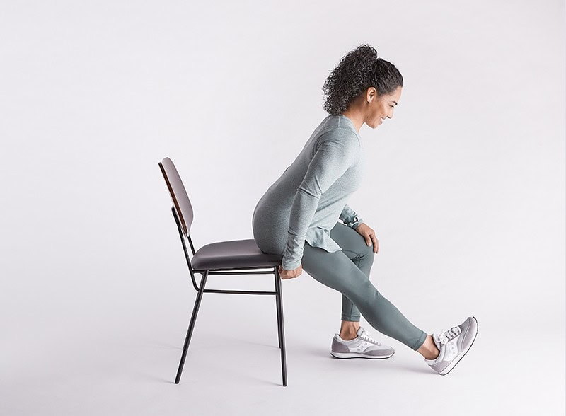 Gradually move forward until you feel a stretch but be sure to pull back if you feel any pain. Hold the pose for 30 seconds before repeating 2 to 5 times. Switch to the left leg and start over.