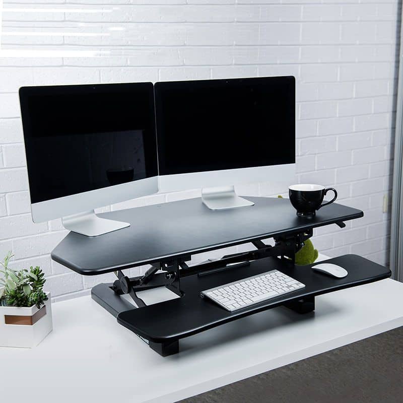 But what if you didn’t have to find a table that’s the exact height you want? You can actually make use of a standing desk converter to elevate your computers or laptops. It also makes it possible to switch between sitting and standing as you work, for a more comfortable and productive experience. If you want to know more about desk converters and risers, read our complete guide here.