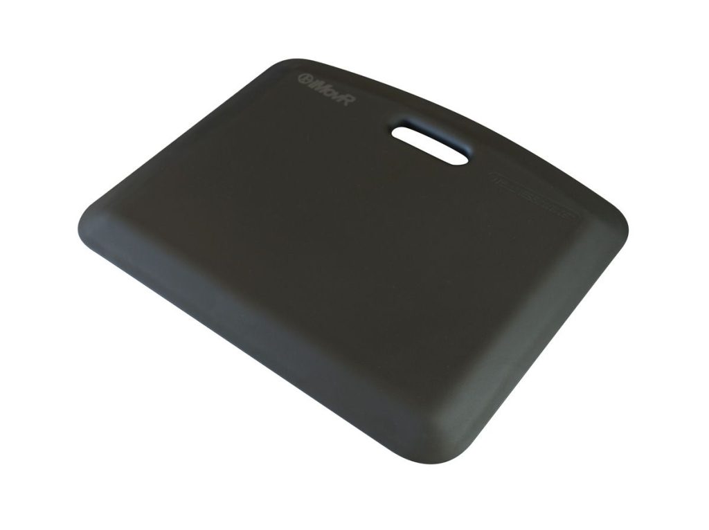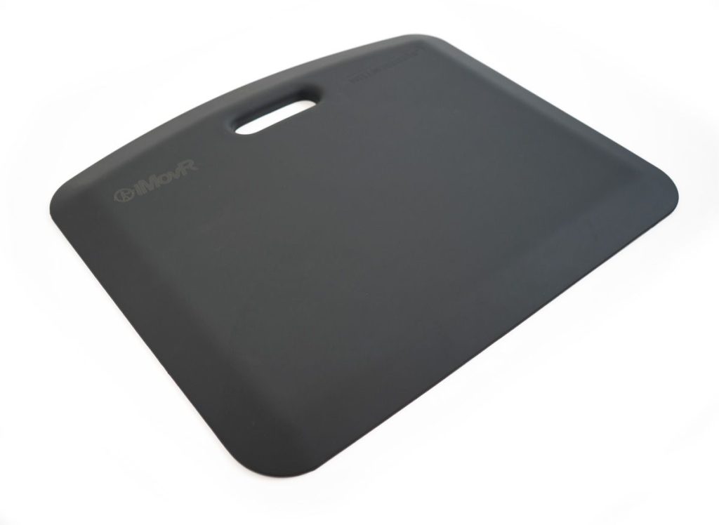 “The size and handle of the iMovR EcoLast Portable Standing Mat make it easy to pick up and move anywhere. Its solid PU material is designed for total shock absorption against unforgiving surfaces, while its textured exterior won’t slip or stain.”