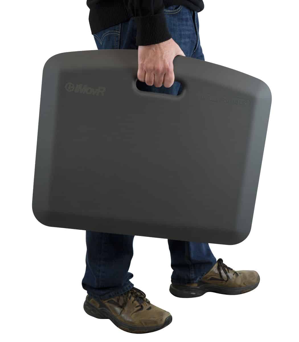 “The size and handle of the iMovR EcoLast Portable Standing Mat make it easy to pick up and move anywhere. Its solid PU material is designed for total shock absorption against unforgiving surfaces, while its textured exterior won’t slip or stain.”