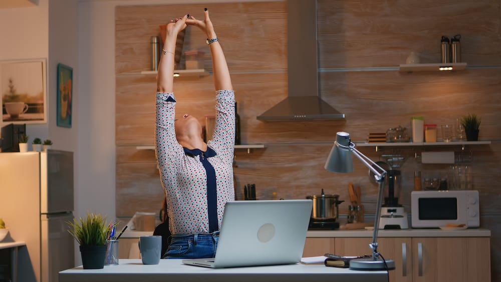 If your shoulders or arms are starting to feel stiff from all the screen staring and typing, you can stretch them out. Pull one arm across your chest and hook your other arm around it. This can pull the tension out of your upper back and rear shoulders. If you want to loosen up more muscles, you can slip in an assisted push-up by placing your hands on your desk, and pushing yourself away from it while in a leaning position.