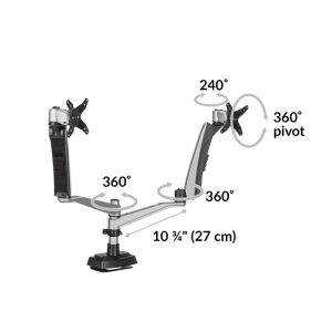 With the VARIDESK Full-Motion Spring Dual Arm, you can position your monitors however you want them to. Whether you want to tilt one and keep one at an angle, turn both screens or rotate them, these 360 degree monitor arms will be able to accommodate you.